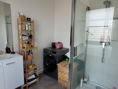 Entrée avec placard, WC, séjour/cuisine ouverte donnant sur une grande terrasse de 15 m² avec vue sur l'église. Une chambre, une salle de douche et un stationnement extérieur. Chauffage Gaz.
